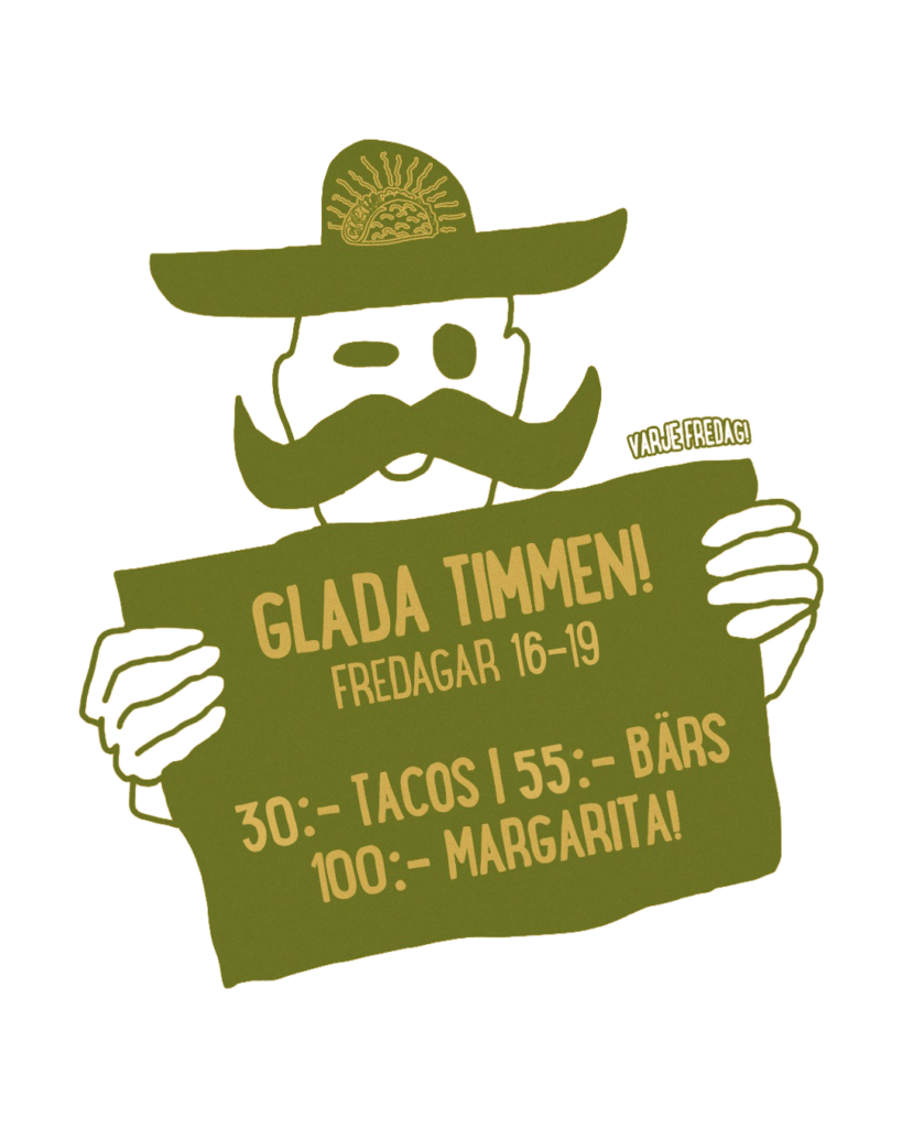 After Work har aldrig varit bättre, Happy Hour har aldrig varit gladare. Sundsvalls fredagar får sig en REJÄL BOOST! Fredagar framöver presenterar vi konceptet koncept ”Glada Timmen”! Med helt overkliga priser såsom 30 spänn för en taco 55 spänn för en Carlsberg på fat och ynka 100 spänn för en Margarita, VARJE FREDAG mellan 16-19:00 på Bloco!